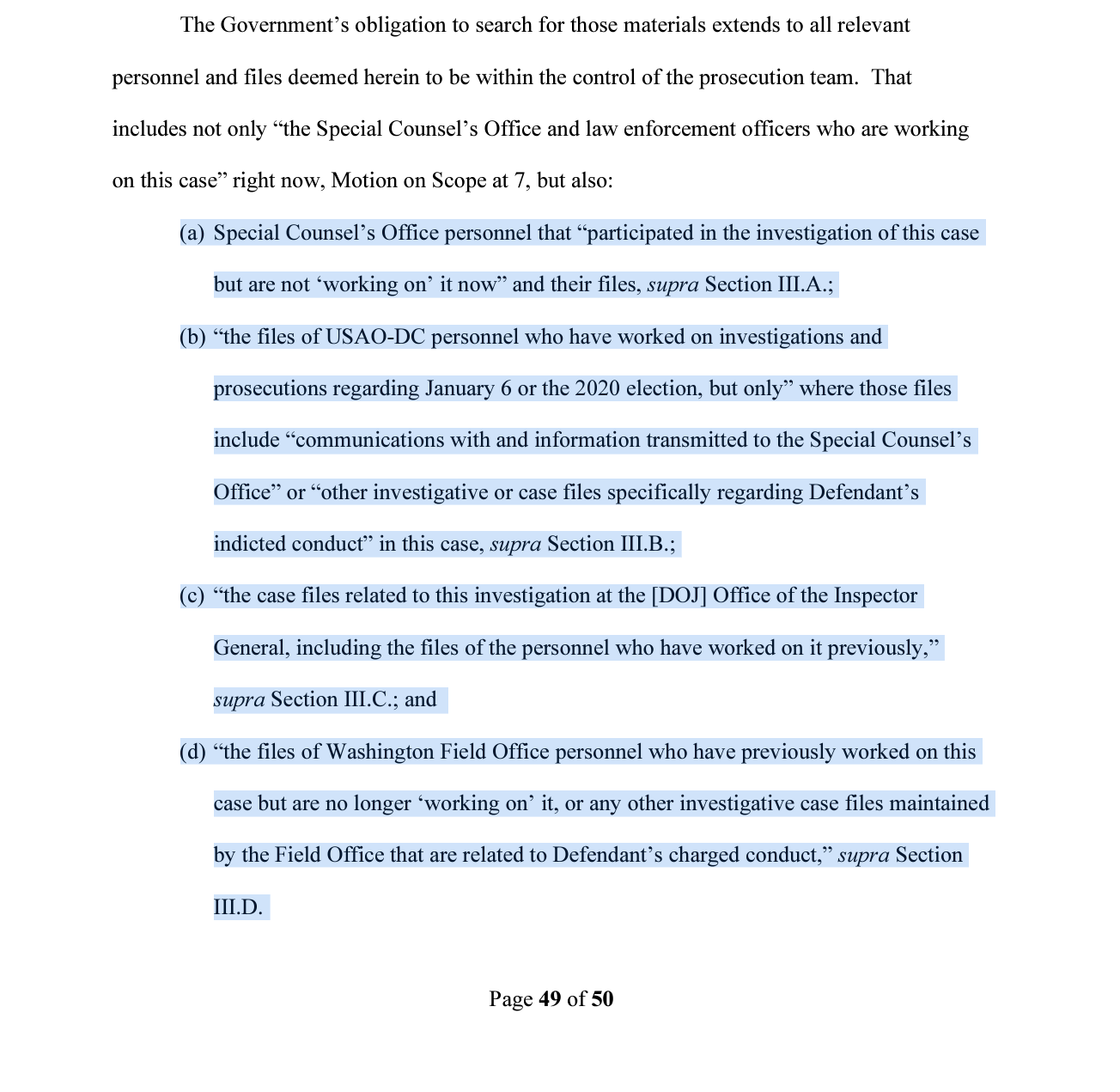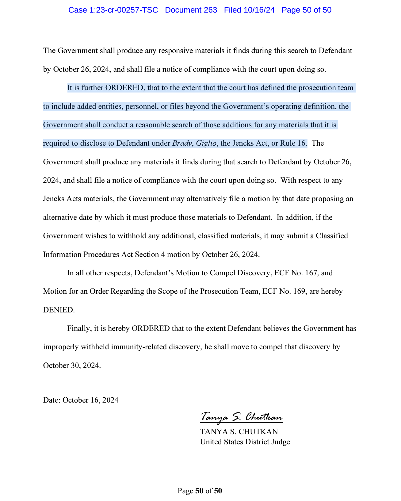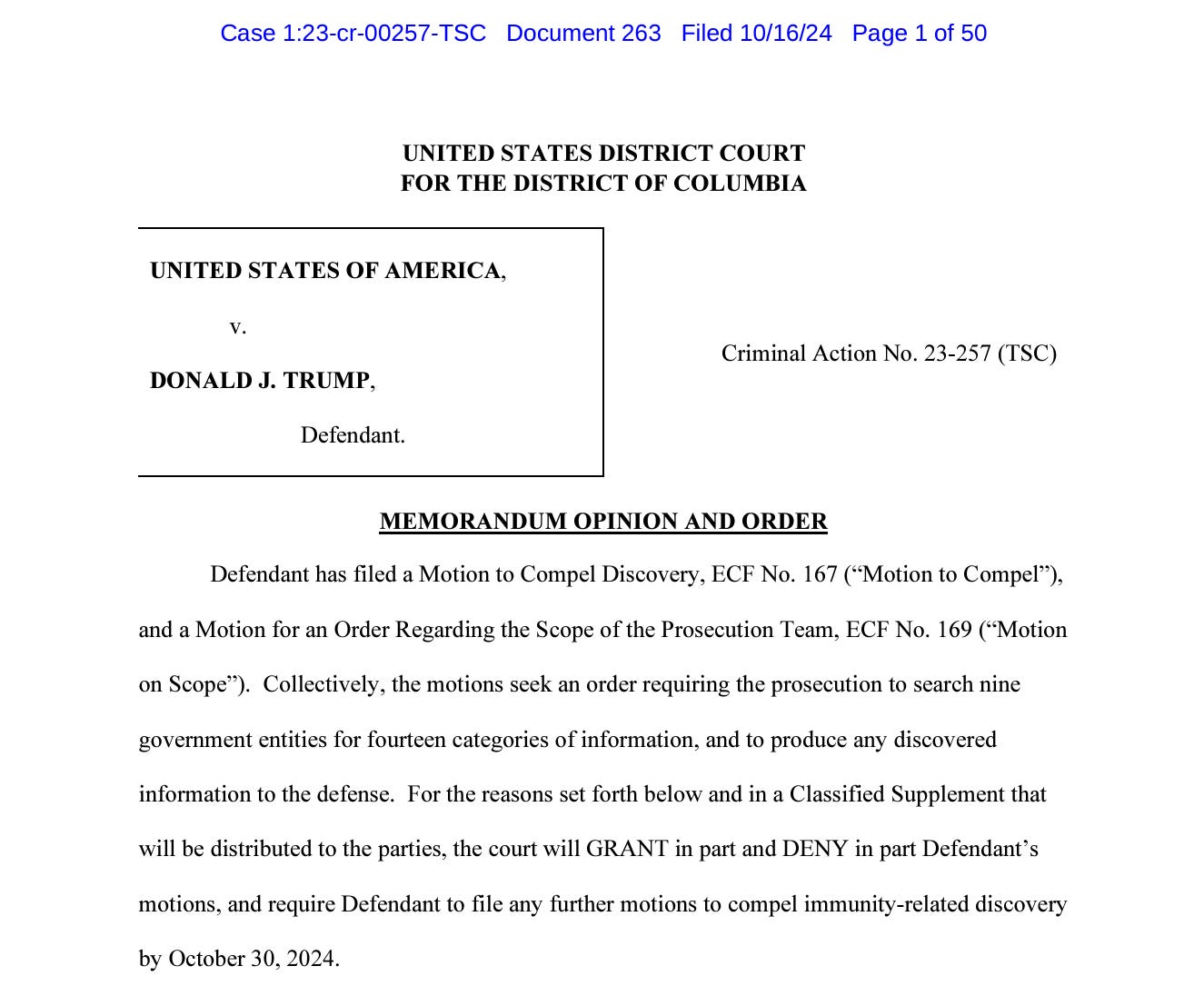 Judge Chutkan has issued a 50-page Order addressing Trump’s Motion to Compel Discovery and his motion for an order defining the prosecution team (for purposes of discovery). We have been waiting since November 2023 for Chutkan to issue an order on these motions.