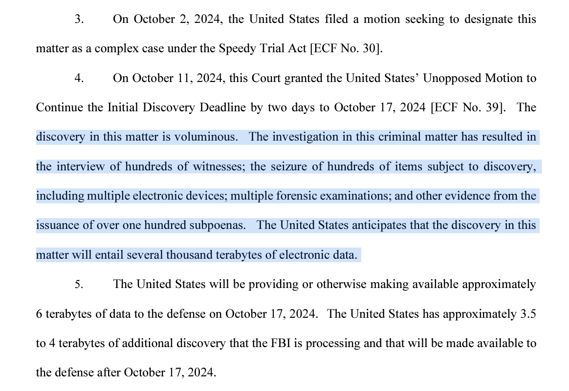 Defense received their first batch of discovery on Thursday—6 terabytes worth.