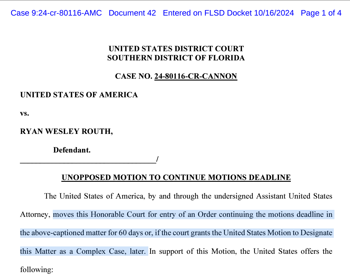DOJ filed a letter motion on Wednesday asking for a 60-day continuance of deadlines, or more, if the case is successfully designated as complex. The motion is unopposed.
