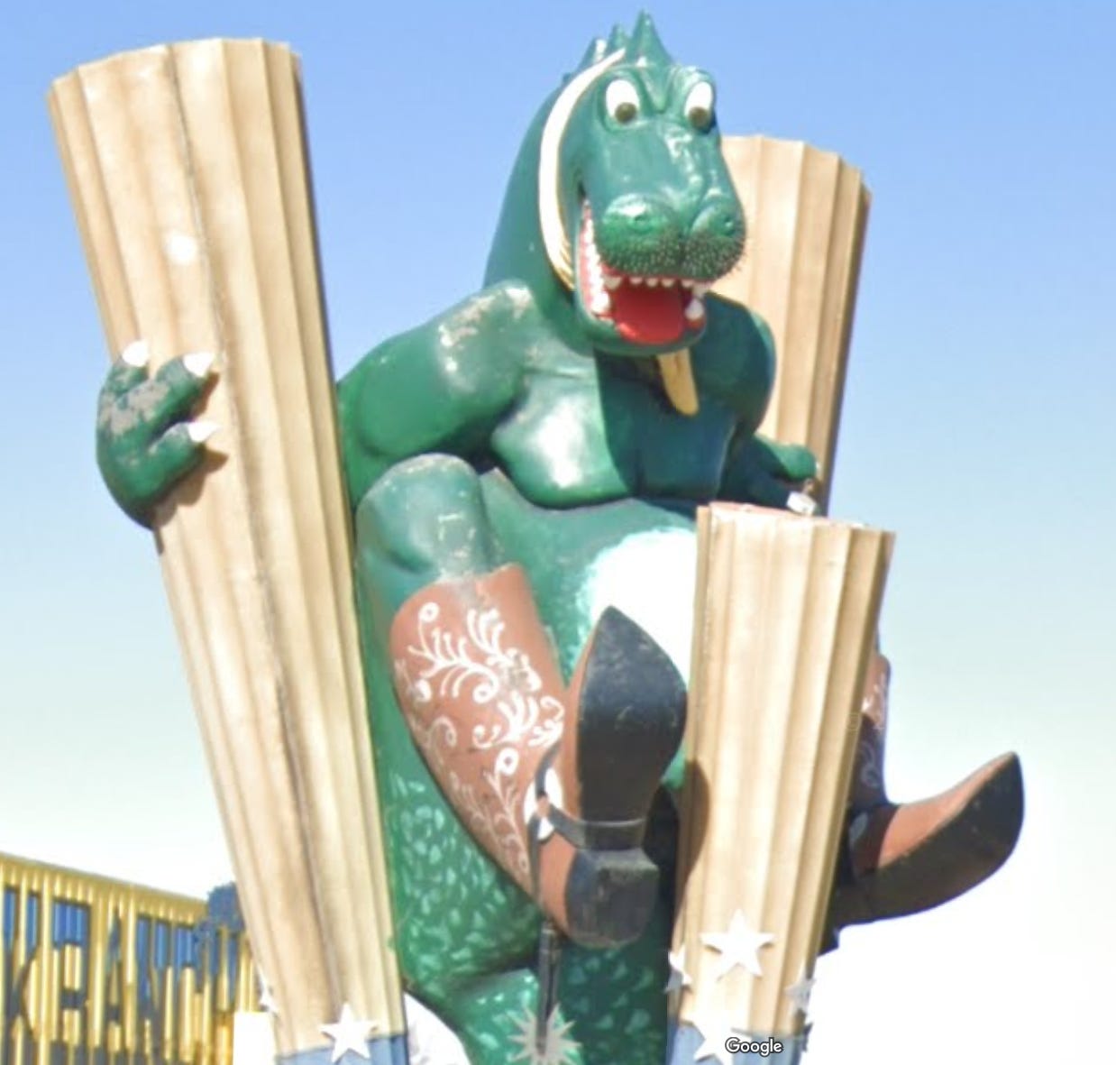 It’s not the Western film set fascades of the buildings and their bright colors, nor the big letters spelling out the name of the establishment. It’s not even the absolutely huge (think heating oil delivery truck) steer guarding the front doors, or whatever the hell is happening with this display.